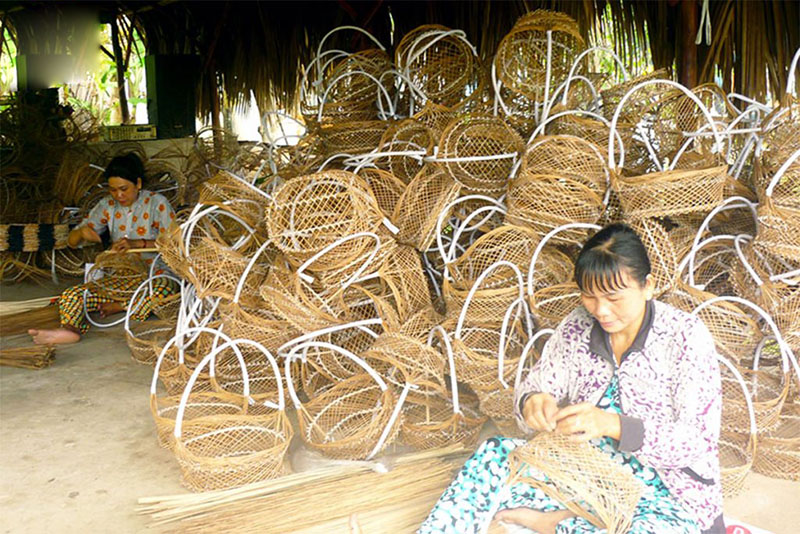 – Làng nghề truyền thống Bến Tre đan giỏ từ cọng dừa.